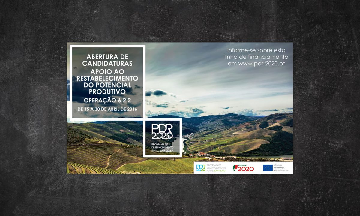 Concepção gráfica de anúncio de Imprensa para o Programa de Desenvolvimento Rural – PDR 2020. Com o objectivo de anunciar a abertura de candidaturas e apoios para financiamentos.